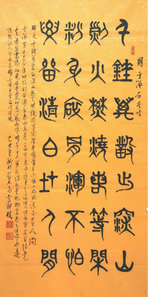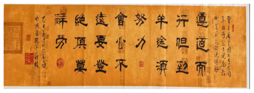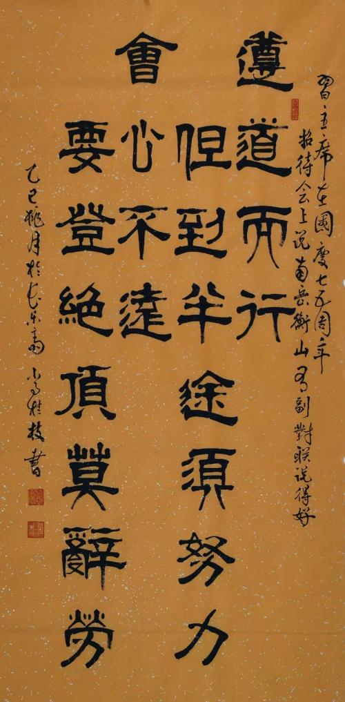 有道是,笔性墨情,皆以其人之性情为本。是则理性情者,书之首务也。而今日在常桂枝先生的众幅书法作品中,我们也同样是能很清楚地感受到他那极其不俗的性情流露!不仅如此,得益于对翰墨取法的博观之道,常桂枝先生的书法气象也是有从碑帖中获益良多,是谓既有帖学一脉的书卷气概,亦有碑法一路的朴茂雄强,致使行、草、篆、隶、楷皆是可以写得遂心应手!不在乎一点一画之中的细节摆弄,而是在整幅书法作品的精神气势上做文章,或寄以骋纵横之志,或托以散郁结之怀,造诣之深,令人叹服!